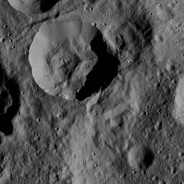 The Dawn unmanned spacecraft, has maneuvered itself into orbit around one of the biggest asteroids named Ceres. Below is one of many close in photographs of the surface of Ceres.
